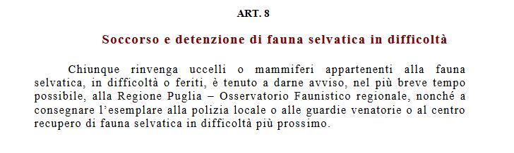 - In Puglia la LIPU non ha centri di recupero e pertanto, in caso di necessità, può apportare un primo soccorso nell’attesa di cure specifiche che per legge sono demandate al più vicino centro recupero o di prima accoglienza fauna. Al momento quello più vicino è il Centro di recupero della Regione presso l’Osservatorio faunistico regionale di Bitetto (Ba). Il Centro di prima accoglienza in provincia di Foggia è al momento chiuso da anni.